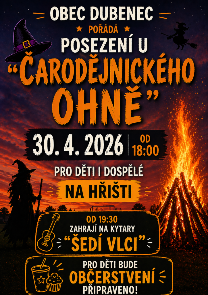 Obec Dubenec pořádá posezení Čarodějnického ohně, které se uskuteční 30. dubna 2026 od 18:00. Tato akce je určena pro děti i dospělé a zahrnuje hudební vystoupení "Šedých vlků".